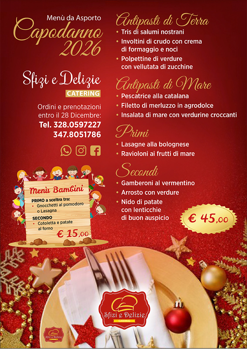 Festeggia l’arrivo del nuovo anno con il Menù da Asporto di Capodanno 2026 di Sfizi e Delizie: un percorso di sapori pensato per rendere speciale la tua tavola senza rinunciare alla comodità di casa. Un’ampia selezione di antipasti di terra e di mare, primi piatti della tradizione e secondi raffinati, accompagnati dall’immancabile piatto di lenticchie di buon auspicio. Ingredienti scelti, preparazioni curate e tutta l’esperienza del nostro catering per un Capodanno all’insegna del gusto e della convivialità.